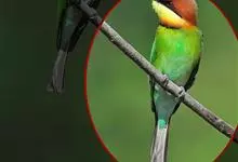 蓝喉蜂是蜂虎科蜂虎属鸟类。体长26-28厘米,嘴长而弯曲,有明显细长的中央尾羽。头部、颈部和背部为巧克力色,有黑色眼纹。喉部、腰部和尾羽为蓝色。腹部和两翼为绿色。幼鸟外观似成鸟,头部、颈部和背部为绿色,…全部>>