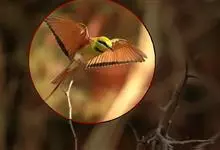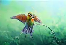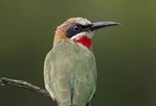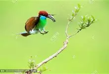 栗喉蜂虎是蜂虎科蜂虎属的鸟类。有热带鸟类羽毛艳丽的特征:喉部是栗红色的,黑色的过眼纹,翅膀和背部是绿色的,尾翼是蓝色的,飞行时翅膀下面的羽毛是橙黄色的,在阳光的照射下,它们全身闪烁着金属般的艳丽光泽,…全部>>