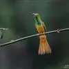 绿喉蜂虎是佛法僧目、蜂虎科的小型鸟类,共有9个亚种。身长22-25厘米,翼展29-30厘米,体重15-20克。喉绿色,额部、头顶至上背为锈红色,其余上体均为亮绿色。中央尾羽延长且端段狭细,…全部>>
