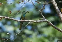 蓝须夜蜂虎是佛法僧目、蜂虎科的鸟类,体长约30厘米,是绿色林栖型蜂虎,蓝色的胸羽蓬松,嘴厚重而下弯。成鸟顶冠淡蓝,腹部棕黄带绿色纵纹。尾羽腹面黄褐。亚成鸟全身绿色。喉、胸部中央的羽甚长和亮色;该物种…全部>>