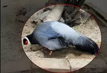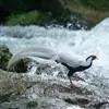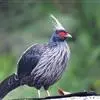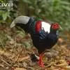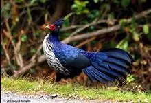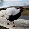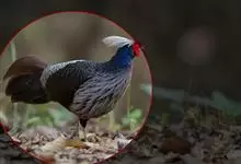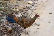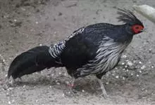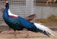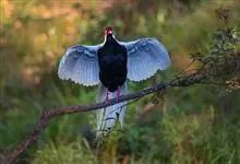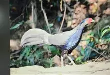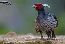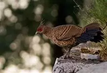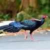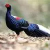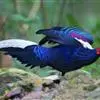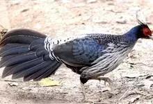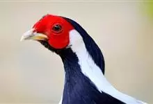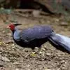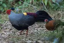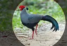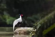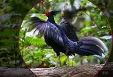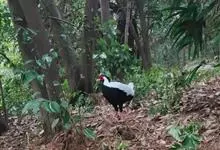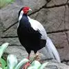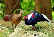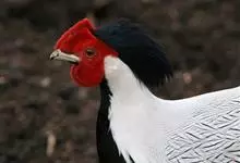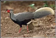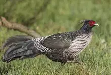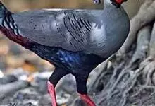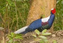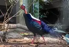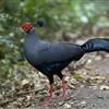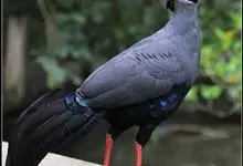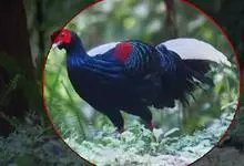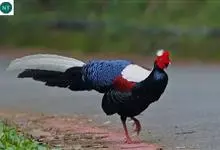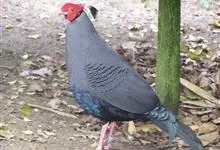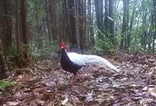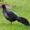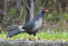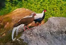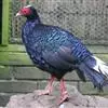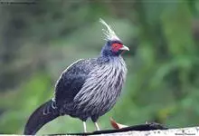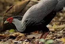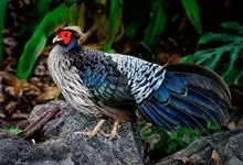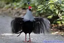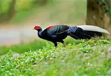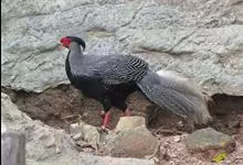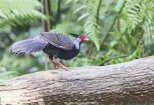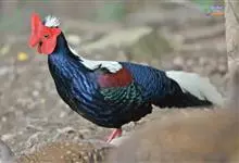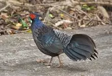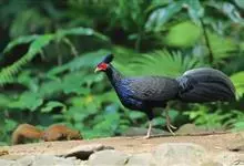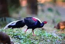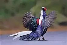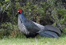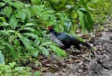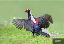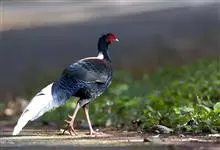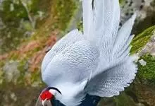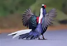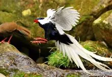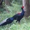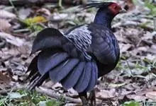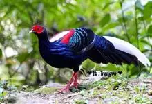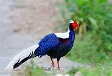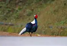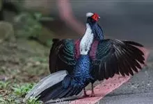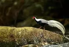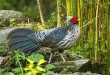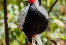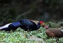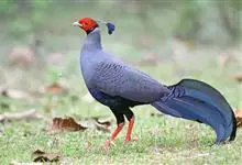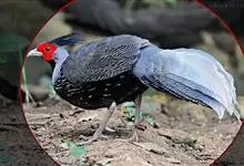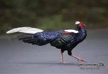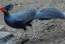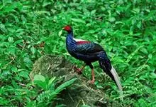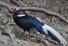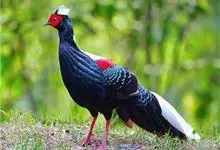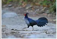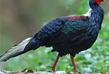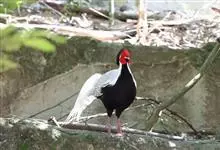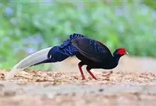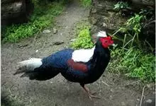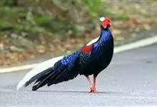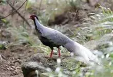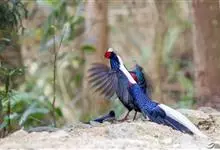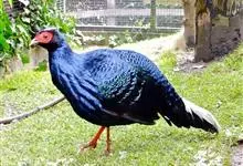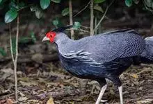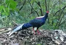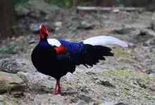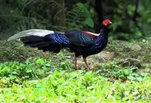 蓝鹇是雉科、鹇属一种大型雉类。体长50-80厘米。雄鸟头颈黑色,羽冠白色,有时杂以黑斑;脸红色,额部肉冠和脸部肉垂亦为红色;后颈和颈侧蓝黑色;肩赤红色;翅上覆羽及外侧次级飞羽黑色,…全部>>