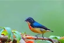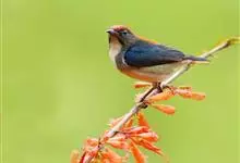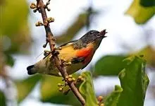 红胸啄花鸟:体重5-10克,体长60-92毫米。体形纤小。雄鸟上体呈辉亮的金属绿色;下体棕黄,胸部具一朱红色块斑,极易与其他啄花鸟区别。雌鸟上体呈橄榄绿,下体棕黄色。虹膜褐色,嘴褐黑色或角灰色,…全部>>
