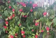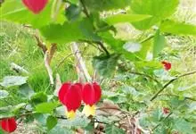 红萼苘麻是锦葵科、苘麻属常绿软木质灌木,叶绿色,长5-10厘米,心形,叶端尖,叶缘有钝锯齿,有时分裂,有细细的叶柄;叶互生,掌状叶脉;花单生于叶腋,具长梗,下垂;花萼红色,半套着大约4厘米长的花瓣,…全部>>