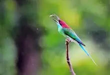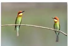 蓝颊蜂虎:是蜂虎科、蜂虎属的鸟类,共有2个亚种。体长27-33厘米,翼展46-49厘米,体重38-50克。嘴形细长而下弯,先端尖,…全部>>