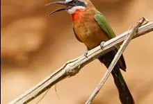 栗喉蜂虎是蜂虎科蜂虎属的鸟类。有热带鸟类羽毛艳丽的特征:喉部是栗红色的,黑色的过眼纹,翅膀和背部是绿色的,尾翼是蓝色的,飞行时翅膀下面的羽毛是橙黄色的,在阳光的照射下,它们全身闪烁着金属般的艳丽光泽,…全部>>