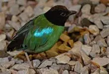 绿胸八色鸫:是雀形目八色鸫科的鸟类,共有12个亚种。体长为16-18厘米,体重65-69克。体型圆胖,尾短,腿长。头黑,上体绿色,两翼深色而具白色斑纹,头顶至后枕深褐,胸及腹部苹果绿,臀亮红。…全部>>