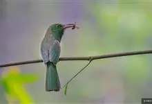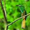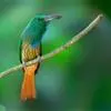 绿喉蜂虎是佛法僧目、蜂虎科的小型鸟类,共有9个亚种。身长22-25厘米,翼展29-30厘米,体重15-20克。喉绿色,额部、头顶至上背为锈红色,其余上体均为亮绿色。中央尾羽延长且端段狭细,…全部>>