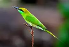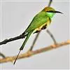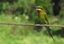 绿喉蜂虎是佛法僧目、蜂虎科的小型鸟类,共有9个亚种。身长22-25厘米,翼展29-30厘米,体重15-20克。喉绿色,额部、头顶至上背为锈红色,其余上体均为亮绿色。中央尾羽延长且端段狭细,…全部>>