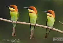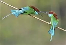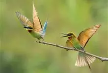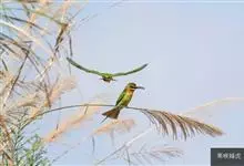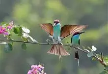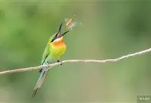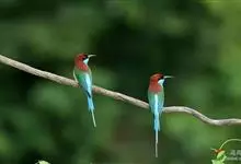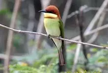 栗喉蜂虎是蜂虎科蜂虎属的鸟类。有热带鸟类羽毛艳丽的特征:喉部是栗红色的,黑色的过眼纹,翅膀和背部是绿色的,尾翼是蓝色的,飞行时翅膀下面的羽毛是橙黄色的,在阳光的照射下,它们全身闪烁着金属般的艳丽光泽,…全部>>