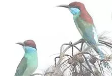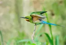 蓝喉蜂是蜂虎科蜂虎属鸟类。体长26-28厘米,嘴长而弯曲,有明显细长的中央尾羽。头部、颈部和背部为巧克力色,有黑色眼纹。喉部、腰部和尾羽为蓝色。腹部和两翼为绿色。幼鸟外观似成鸟,头部、颈部和背部为绿色,…全部>>