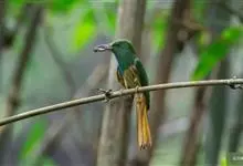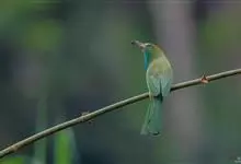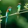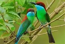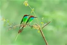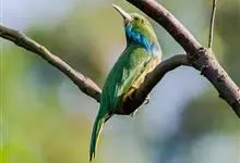 蓝喉蜂是蜂虎科蜂虎属鸟类。体长26-28厘米,嘴长而弯曲,有明显细长的中央尾羽。头部、颈部和背部为巧克力色,有黑色眼纹。喉部、腰部和尾羽为蓝色。腹部和两翼为绿色。幼鸟外观似成鸟,头部、颈部和背部为绿色,…全部>>