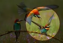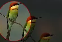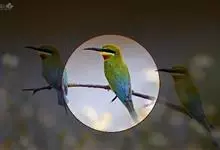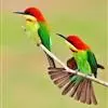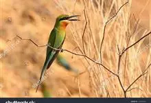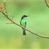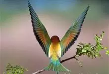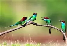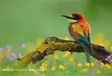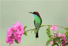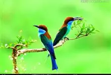 栗喉蜂虎是蜂虎科蜂虎属的鸟类。有热带鸟类羽毛艳丽的特征:喉部是栗红色的,黑色的过眼纹,翅膀和背部是绿色的,尾翼是蓝色的,飞行时翅膀下面的羽毛是橙黄色的,在阳光的照射下,它们全身闪烁着金属般的艳丽光泽,…全部>>