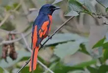 灰喉山椒鸟:共有8个亚种。体长18-22厘米。雄鸟头部和背亮黑色,腰、尾上覆羽和下体朱红色,翅黑色具一大一小的两道朱红色翼斑。中央尾羽黑色,外侧尾羽基部黑色,端部红色。…全部>>