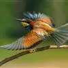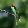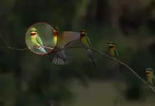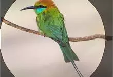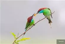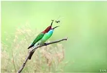 栗喉蜂虎是蜂虎科蜂虎属的鸟类。有热带鸟类羽毛艳丽的特征:喉部是栗红色的,黑色的过眼纹,翅膀和背部是绿色的,尾翼是蓝色的,飞行时翅膀下面的羽毛是橙黄色的,在阳光的照射下,它们全身闪烁着金属般的艳丽光泽,…全部>>