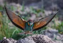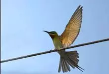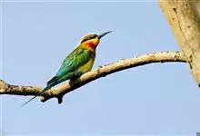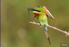 栗喉蜂虎是蜂虎科蜂虎属的鸟类。有热带鸟类羽毛艳丽的特征:喉部是栗红色的,黑色的过眼纹,翅膀和背部是绿色的,尾翼是蓝色的,飞行时翅膀下面的羽毛是橙黄色的,在阳光的照射下,它们全身闪烁着金属般的艳丽光泽,…全部>>