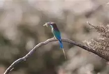 蓝喉蜂是蜂虎科蜂虎属鸟类。体长26-28厘米,嘴长而弯曲,有明显细长的中央尾羽。头部、颈部和背部为巧克力色,有黑色眼纹。喉部、腰部和尾羽为蓝色。腹部和两翼为绿色。幼鸟外观似成鸟,头部、颈部和背部为绿色,…全部>>