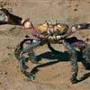 椰子蟹,十足目寄居蟹科椰子蟹属的节肢动物,又称八卦蟹。椰子蟹头胸部圆形而向前突出,腹部一部分折向头胸部腹面;足粗壮,左螯比右螯稍大;鳃腔的内壁有多丛血管,可助呼吸。椰子蟹能用钳子弄破椰子的外壳,…全部>>