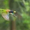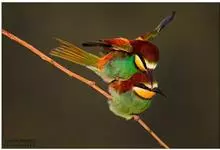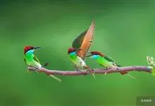 栗喉蜂虎是蜂虎科蜂虎属的鸟类。有热带鸟类羽毛艳丽的特征:喉部是栗红色的,黑色的过眼纹,翅膀和背部是绿色的,尾翼是蓝色的,飞行时翅膀下面的羽毛是橙黄色的,在阳光的照射下,它们全身闪烁着金属般的艳丽光泽,…全部>>