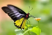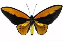 金裳凤蝶是凤蝶科、裳凤蝶属的动物。金裳凤蝶身体呈黑色,头、颈和胸侧有红毛,腹部有黑黄两色相间条纹,雄蝶前翅黑色,具黑天鹅绒光泽,各脉两侧灰白色,后翅金黄色,各室外缘有等腰三角形黑斑1枚,斑内侧有晕,…全部>>