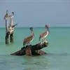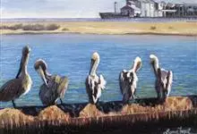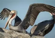 褐鹈鹕:是鹈鹕家族中体型最小的成员。体型粗大,体重6.5-9千克。嘴形宽大直长,上嘴尖端朝下弯曲,呈钩状;下嘴分左右二支,其间有一巨大而能扩缩的皮肤喉囊;鼻孔小,而位于嘴基。眼前部裸出。颈长而较细小…全部>>