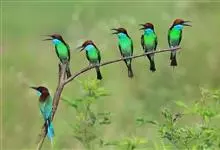 蓝颊蜂虎:是蜂虎科、蜂虎属的鸟类,共有2个亚种。体长27-33厘米,翼展46-49厘米,体重38-50克。嘴形细长而下弯,先端尖,…全部>>