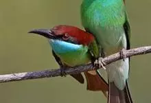 栗喉蜂虎是蜂虎科蜂虎属的鸟类。有热带鸟类羽毛艳丽的特征:喉部是栗红色的,黑色的过眼纹,翅膀和背部是绿色的,尾翼是蓝色的,飞行时翅膀下面的羽毛是橙黄色的,在阳光的照射下,它们全身闪烁着金属般的艳丽光泽,…全部>>