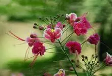 洋金凤 Sw.)是豆科、云实属植物。枝光滑,绿色或粉绿色,散生疏刺。二回羽状复叶;羽片4-8对,对生;小叶7-11对,长圆形或倒卵形,顶端凹缺;小叶柄短。总状花序近伞房状,顶生或腋生,…全部>>