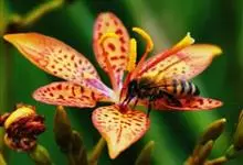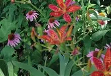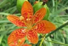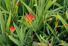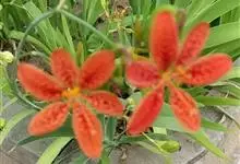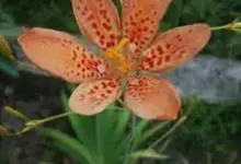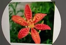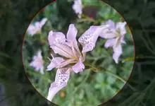 射干 Redouté)是鸢尾科射干属多年生草本植物。根状茎为不规则的块状,斜黄色或黄褐色;花橙红色,散生紫褐色的斑点;花药呈条形;子房下位,倒卵形;蒴果倒卵形或长椭圆形;种子圆球形,黑紫色,有光泽。…全部>>