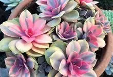 紫珍珠是景天科石莲花属的多年生肉质草本植物。植株中小型;叶片肉质,匙形,呈莲座状紧密排列;叶片粉紫色,叶缘呈粉白色,光照充足时颜色亮丽,不足时叶色会呈现深绿色或灰绿色,叶面光滑,被轻微白粉,…全部>>