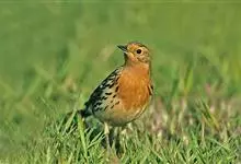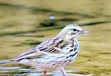 粉红胸鹨:属小型鸣禽,体重18-27克,体长13-18厘米。非繁殖期粉皮黄色的粗眉线明显,背灰而具黑色粗纵纹,胸及两胁具浓密的黑色点斑或纵纹。虹膜暗褐色;嘴黑褐色;下嘴基部色较淡,呈角褐色;跗蹠和趾…全部>>