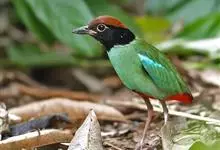 绿胸八色鸫:是雀形目八色鸫科的鸟类,共有12个亚种。体长为16-18厘米,体重65-69克。体型圆胖,尾短,腿长。头黑,上体绿色,两翼深色而具白色斑纹,头顶至后枕深褐,胸及腹部苹果绿,臀亮红。…全部>>
