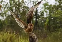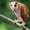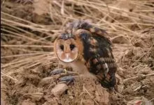 栗鸮:是鸟纲、草鸮科的猫头鹰。体长约29厘米,体重311-360克。是一种中等体型的红褐色鸮。其心形脸庞及时而竖起的“耳朵”与仓鸮甚似。上体红褐而具黑白点斑,下体皮黄偏粉具黑点,脸近粉色。虹膜深褐色,…全部>>