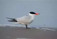 红嘴巨鸥,大型水鸟,体长47~55厘米。夏羽前额、头顶、枕和冠羽黑色。后颈、尾上覆羽和尾白色,尾呈叉状。背、肩和翅上覆羽银灰色。眼先和眼及耳羽以下头侧白色;颏、喉和整个下体也为白色。冬羽和夏羽大致相似,…全部>>