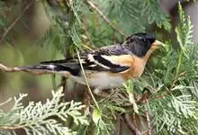 燕雀属小型鸟类,体长14-17厘米。嘴粗壮而尖,呈圆锥状。雄鸟从头至背辉黑色,背具黄褐色羽缘。腰白色,颏、喉、胸橙黄色,腹至尾下覆羽白色,两胁淡棕色而具黑色斑点。两翅和尾黑色,翅上具白斑。…全部>>