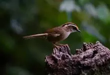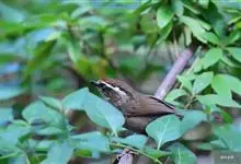 褐胁雀鹛,是莺科、雀鹛属的鸟类。褐胁雀鹛是小型鸟类,体长13-15厘米。头顶棕褐色,黑色侧冠纹和宽阔的白色眉纹,眼先黑色。上体包括两翅和尾橄榄褐色。颏、喉、胸、腹白色,腹和胸沾皮黄色,两胁橄榄褐色,…全部>>
