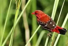 红梅花雀小型鸟类,体长9-10厘米。雄鸟通体朱红色,背、肩、胸等满布白色小斑点,两翅和尾黑褐色均具白色端斑,嘴红色,脚蜡黄色。雌鸟上体淡褐色或赭褐色,翅上中覆羽、大覆羽和内侧飞羽末端具白色斑点,…全部>>