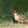 黄腹角雉:是鸟纲、雉科中国特产的一种鸟类。体长约50-65厘米。雄鸟上体栗褐色,满布具黑缘的淡黄色圆斑。头顶黑色,具黑色与栗红色羽冠。飞羽黑褐带棕黄斑。下体几纯棕黄,因腹部羽毛呈皮黄色,…全部>>