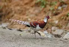 白颈长尾雉:大型鸡类,体长81厘米,体型大小和雉鸡相似。雄鸟头灰褐色,颈白色,脸鲜红色,其上后缘有一显著白纹,上背、胸和两翅栗色,上背和翅上均具1条宽阔的白色带,极为醒目;下背和腰黑色而具白斑;腹白…全部>>