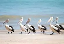 澳大利亚鹈鹕是一种大型涉禽,体重达13千克。生活于沿海及河川、湖泊等处。飞行力强而悠逸,常群飞群栖,极善于游泳,但不会潜水。游泳时张口捕鱼,将捕得的鱼兜入喉囊内。有时结群,排成长线,…全部>>