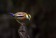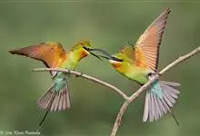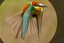 栗喉蜂虎是蜂虎科蜂虎属的鸟类。有热带鸟类羽毛艳丽的特征:喉部是栗红色的,黑色的过眼纹,翅膀和背部是绿色的,尾翼是蓝色的,飞行时翅膀下面的羽毛是橙黄色的,在阳光的照射下,它们全身闪烁着金属般的艳丽光泽,…全部>>