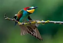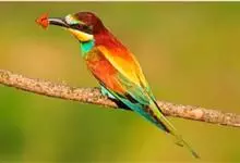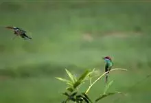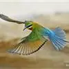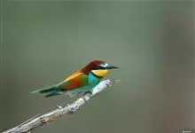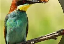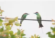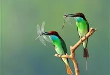 栗喉蜂虎是蜂虎科蜂虎属的鸟类。有热带鸟类羽毛艳丽的特征:喉部是栗红色的,黑色的过眼纹,翅膀和背部是绿色的,尾翼是蓝色的,飞行时翅膀下面的羽毛是橙黄色的,在阳光的照射下,它们全身闪烁着金属般的艳丽光泽,…全部>>