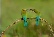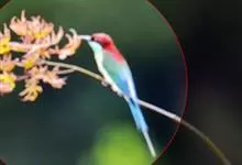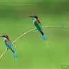 蓝喉蜂是蜂虎科蜂虎属鸟类。体长26-28厘米,嘴长而弯曲,有明显细长的中央尾羽。头部、颈部和背部为巧克力色,有黑色眼纹。喉部、腰部和尾羽为蓝色。腹部和两翼为绿色。幼鸟外观似成鸟,头部、颈部和背部为绿色,…全部>>