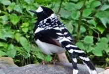 斑背燕尾是鹟科、燕尾属中型鸟类,体长24-25厘米。额至头顶前部白色,其余头、颏、喉、胸黑色,后颈有一白领,背黑色具圆形白色斑点,腰白色,两翅黑色具白色翅斑,尾呈深叉状,黑色、具白色端斑。…全部>>
