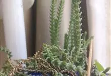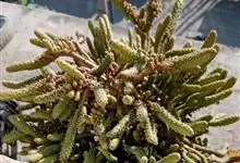 筒叶花月,是景天科青锁龙属的多年生草本植物。植株多分株,灌木状,茎较粗壮,圆柱形,表皮灰褐色;叶片肉质,互生,呈圆筒状,簇生于茎或分枝顶端,叶端呈斜截形,截面为椭圆形;花呈星状,淡白色;花期秋季。…全部>>