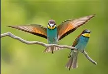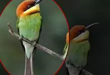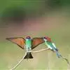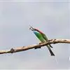 栗喉蜂虎是蜂虎科蜂虎属的鸟类。有热带鸟类羽毛艳丽的特征:喉部是栗红色的,黑色的过眼纹,翅膀和背部是绿色的,尾翼是蓝色的,飞行时翅膀下面的羽毛是橙黄色的,在阳光的照射下,它们全身闪烁着金属般的艳丽光泽,…全部>>