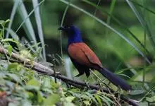 褐翅鸦鹃,是鹃形目鸦鹃科鸦鹃属的鸟类。褐翅鸦鹃的身体为黑色;头颈和胸带蓝紫色金属光泽并具黑亮的羽干纹,下胸至腹部泛金属绿光泽;两翼和肩部为棕栗色,外侧飞羽具暗色羽端,尾羽闪铜绿色光泽;虹膜赤红色,…全部>>