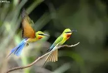 栗喉蜂虎是蜂虎科蜂虎属的鸟类。有热带鸟类羽毛艳丽的特征:喉部是栗红色的,黑色的过眼纹,翅膀和背部是绿色的,尾翼是蓝色的,飞行时翅膀下面的羽毛是橙黄色的,在阳光的照射下,它们全身闪烁着金属般的艳丽光泽,…全部>>