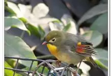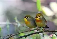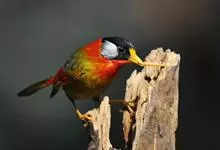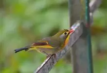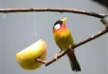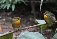 银耳相思鸟小型鸟类,体长14~18厘米。头顶黑色,耳羽银灰色,前额橙黄色;外侧飞羽橙黄色,基部朱红色,极为鲜艳、醒目。尾圆形,尾上、尾下覆羽朱红色,尾暗灰褐色,外侧尾羽橙黄色,其余上体橄榄绿或橄榄黄色。…全部>>