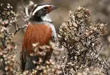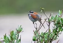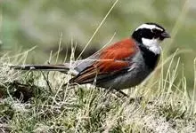 藏鹀:属小型鸣禽。喙为圆锥形,与雀科的鸟类相比较为细弱,上下喙边缘不紧密切合而微向内弯,因而切合线中略有缝隙;体羽似麻雀,此鹀以具有特殊的鲜红栗色背部,及上胸的黑带与下胸的纯灰色等形态特征,…全部>>