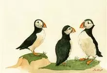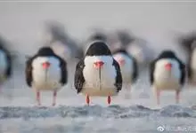 角海鹦:是鸻形目海雀科的鸟类,体重581-648克,体长约32厘米,翼展18-20厘米。是一种身体结实的鸟类,蹼脚、翅膀短,擅长游泳捕鱼,而在陆地上行走时则显得僵硬、步履蹒跚。有一张大嘴巴,呈三角形…全部>>